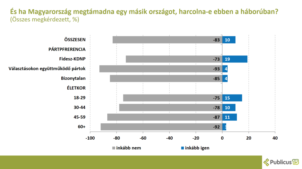 Amennyiben Magyarország megtámadna egy másik országot, akkor a választásokon együttműködő ellenzéki pártok szavazóinak túlnyomó többsége (93 százalék), tízből közel kilenc (85 százalék) bizonytalan szavazó, illetve a Fidesz szavazók háromnegyede (73 százalék) inkább nem harcolna egy ilyen háborúban.