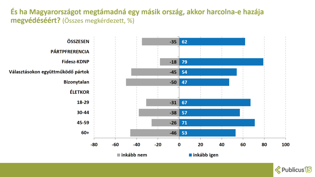 Abban az esetben, ha Magyarországot megtámadná egy másik ország, tízből nyolc (79 százalék) Fidesz szavazó, a választásokon együttműködő ellenzéki pártok szavazóinak a többsége (54 százalék), illetve közel minden második (47 százalék) bizonytalan szavazó harcolna a hazája megvédéséért.