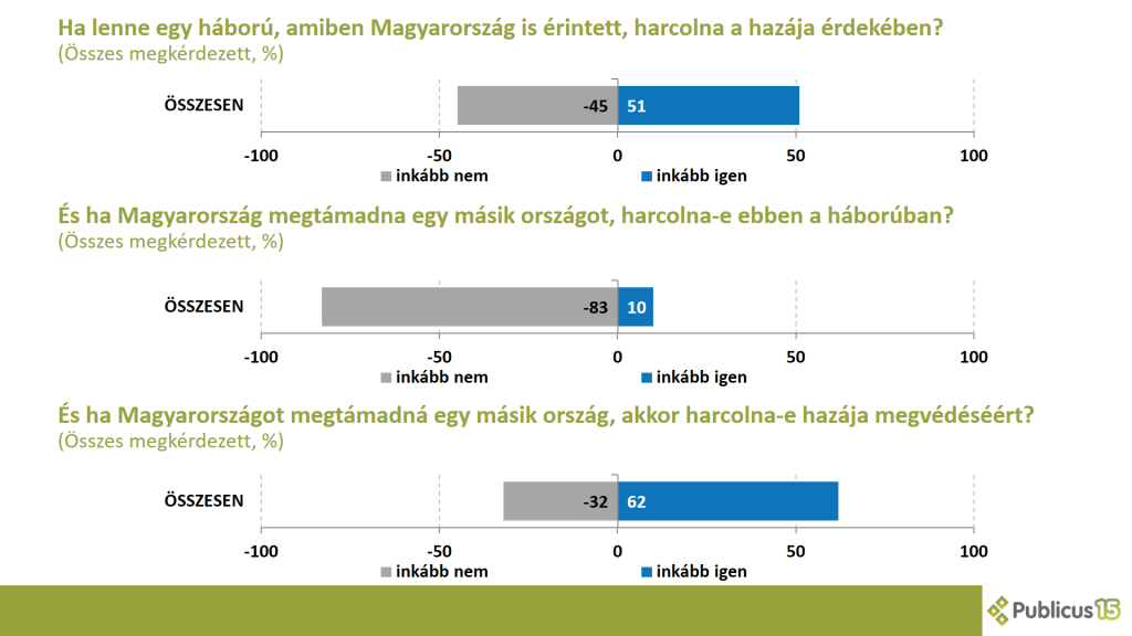 Abban az esetben, ha Magyarországot megtámadná egy másik ország, tízből hat (62 százalék) megkérdezett harcolna a hazája megvédéséért. A válaszadók harmada (35 százalék) azonban inkább nem fogna fegyvert ilyen helyzet esetén.