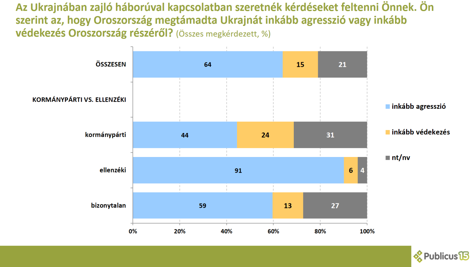 A részleteket vizsgálva két adat figyelemreméltó. Először az, hogy az ellenzéki szavazók körében van 23 százalék aki ebben a kérdésben bizonytalan. Ez a klasszikus „bizonytalanba menekülés” jelensége, amit például a Fidesz szavazók is mutattak, amikor harmaduk nem tudott arra válaszolni, hogy amikor Oroszország megtámadja Ukrajnát, az agresszió-e.