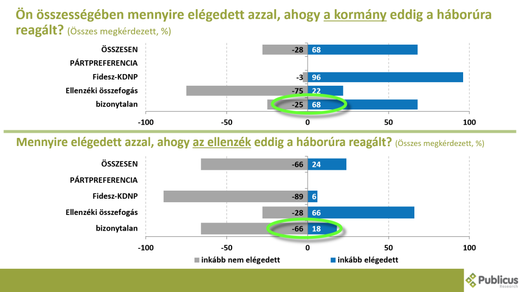 A választók kétharmada (68 százalék) összességében elégedett volt a kormány háborúra adott reakcióival, míg az ellenzék reakcióival kétharmad (66 százalék) elégedetlen volt. A kormánypárti szavazók ebben a kampányban különösen fontossá váló kérdésben teljesen a „kormánnyal voltak”, ám az ellenzéki szavazók ötöde is: 22 százalék inkább elégedett volt a kormánypárti reakciókkal, és 28 százalék elégedetlen az ellenzékiekkel.