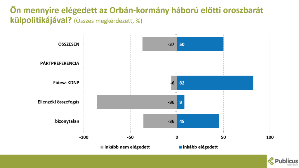 Bár a kampányt megelőzően, sőt a kampány, és így az orosz-ukrán háború kitörése utáni időben is a többség markánsan elégedetlen volt az Orbán-kormány oroszbarát politikájával, a kampányidőszak végére ebben változás állt be. Ugyan csak bizonytalan szavazók álláspontja változott, ám ezzel többségbe kerültek az oroszbarátsággal egyetértők.