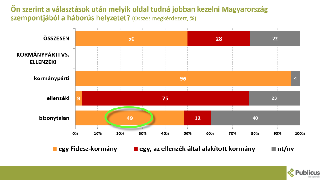 Mindezek után nem meglepő, hogy kétszer annyian (50 vs 28 százalék) gondolták azt, hogy a háborús helyzetet a választások után egy Fidesz-kormány tudja jobban kezelni, és nem egy ellenzék által alakított kormány.