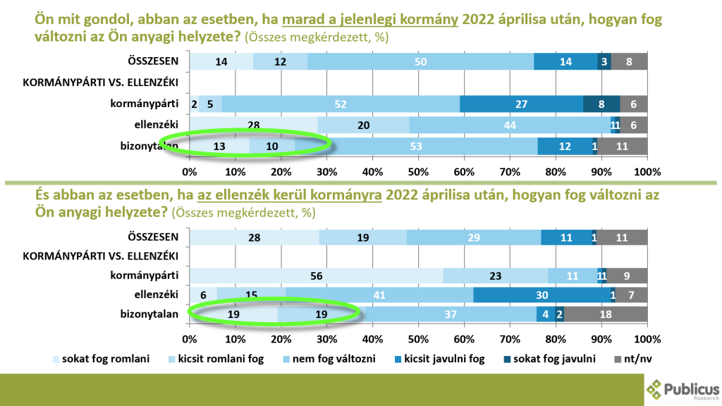 Az ellenzéki szavazók negyede (21 százalék) is a saját anyagi helyzetének a romlására számított egy ellenzéki kormány esetén, míg a Fidesz szavazóknak csak a 7 százaléka várta ezt Fidesz-kormány maradása esetén.