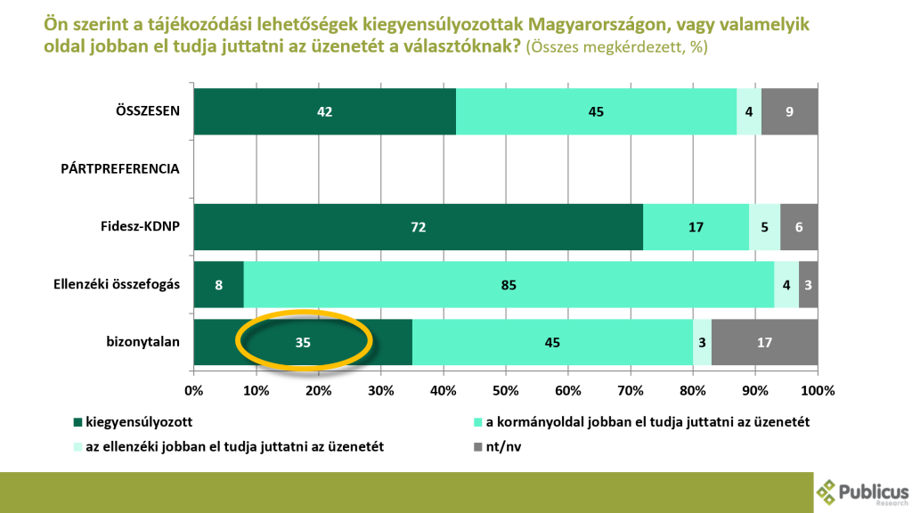 A kampány során, úgy ahogy az elmúlt években is, meglehetősen korlátozottak voltak a kiegyensúlyozott információhoz jutás lehetőségei. És az is egyértelmű, hogy a kormányoldal lehetőségei ebben összehasonlíthatatlanul jobbak, mint az ellenzéké. Ám a bizonytalanok közel fele (35, 45 ellenében) ez nem így gondolja, így nyilván nem is keresett alternatív tájékozódási lehetőségeket. Feltehetően nem is tudja, hogy ezeket hol és miként tegye.