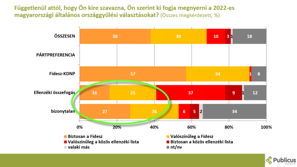 Ami azonban meghatározó: a bizonytalan szavazók mindössze 11 százaléka gondolta azt, hogy az ellenzék nyerhet, ám több mint a felük, 53 százalék inkább a Fidesz győzelmében hitt, és ez bizony közel ötszörös különbség.