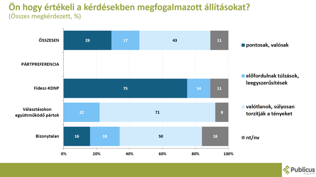 Tízből négy válaszadó (43 százalék) szerint a kérdésekben megfogalmazott állítások valótlanok, súlyosan torzítják a tényeket.  Így nyilatkozott a választásokon együttműködő ellenzéki pártok szavazói közül tízből hét (71 százalék), illetve minden második (50 százalék) bizonytalan szavazó.