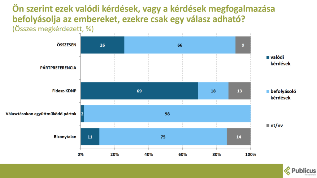A megkérdezettek kétharmada (66 százalék) szerint a kérdések megfogalmazása befolyásolja az embereket, s ezekre csak egy válasz adható. Így gondolja a választásokon együttműködő ellenzéki pártok szavazói közül szinte az összes (98 százalék), a bizonytalan szavazók háromnegyede (75 százalék).