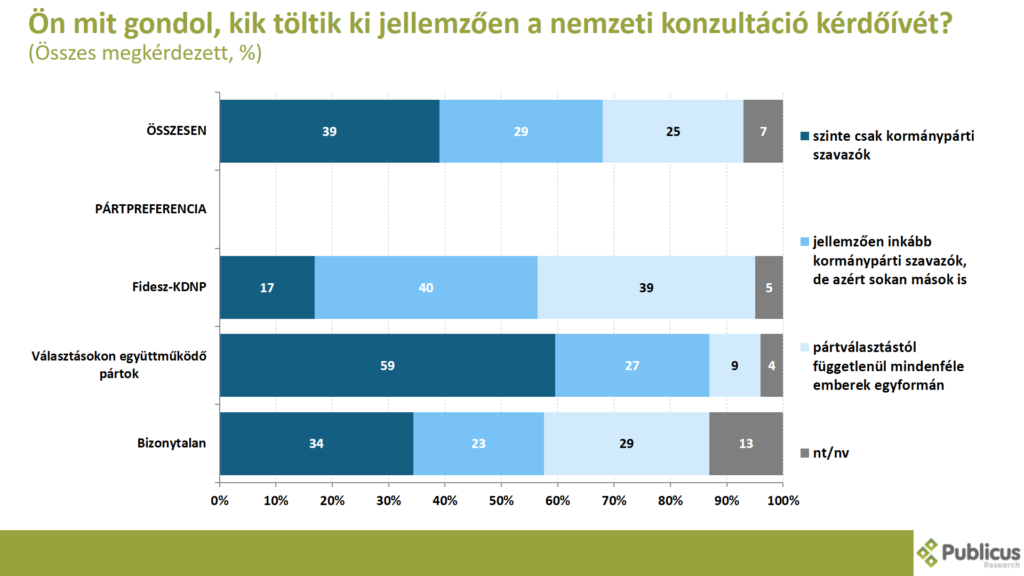 Tízből négy (39 százalék) válaszadó szerint szinte csak kormánypárti szavazók töltik ki jellemzően a nemzeti konzultáció kérdőívét. Így gondolja a választásokon együttműködő ellenzéki pártok szavazói közül tízből hat (59 százalék), a bizonytalan szavazók harmada (34 százalék), illetve a Fidesz szavazók 17 százaléka.