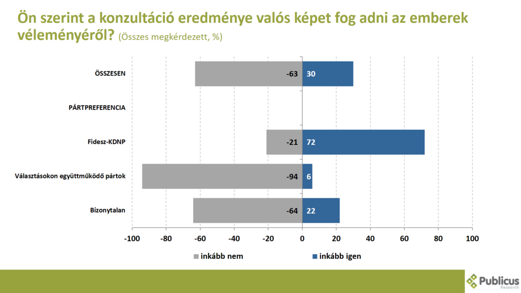 A válaszadók közel kétharmada (63 százalék) szerint a konzultáció eredménye inkább nem fog valós képet adni az emberek véleményéről. Így gondolja a választásokon együttműködő ellenzéki pártok szavazói közül szinte az összes (98 százalék), a bizonytalan szavazók kétharmada (64 százalék), illetve a Fidesz szavazók ötöde (21 százalék).