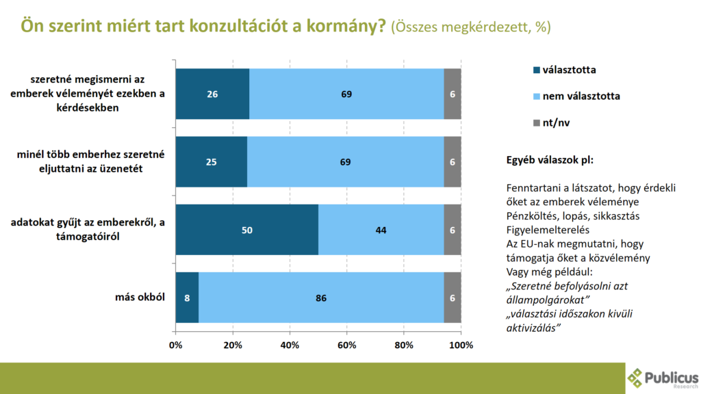 Minden második (50 százalék) megkérdezett szerint a kormány azért tart nemzeti konzultációt, hogy adatokat gyűjtsön az emberekről, a támogatóiról. A válaszadók negyede (26 százalék) szerint a kormány szeretné megismerni az emberek véleményét ezekben a kérdésekben, illetve ugyanilyen arányban (25 százalék) mondták azt, hogy a kormány azért tart ilyet, mert minél több emberhez szeretné eljuttatni az üzenetét.