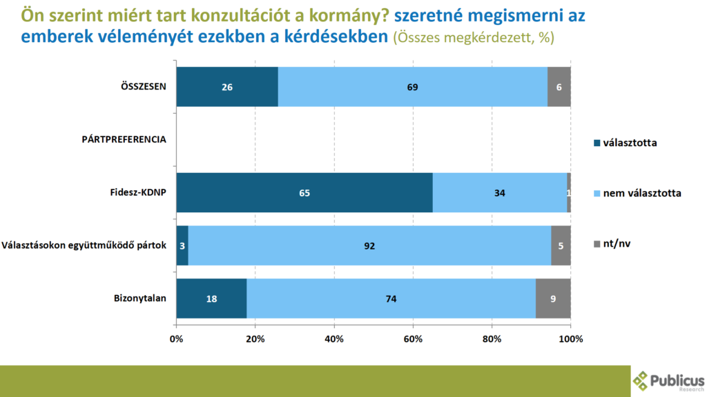 A Fidesz szavazók kétharmada (65 százalék), közel minden ötödik (18 százalék) bizonytalan szavazó, illetve a választásokon együttműködő ellenzéki pártok szavazóinak a 3 százaléka szerint azért tart konzultációt a kormány, mert szeretnémegismerni az emberek véleményét ezekben a kérdésekben.