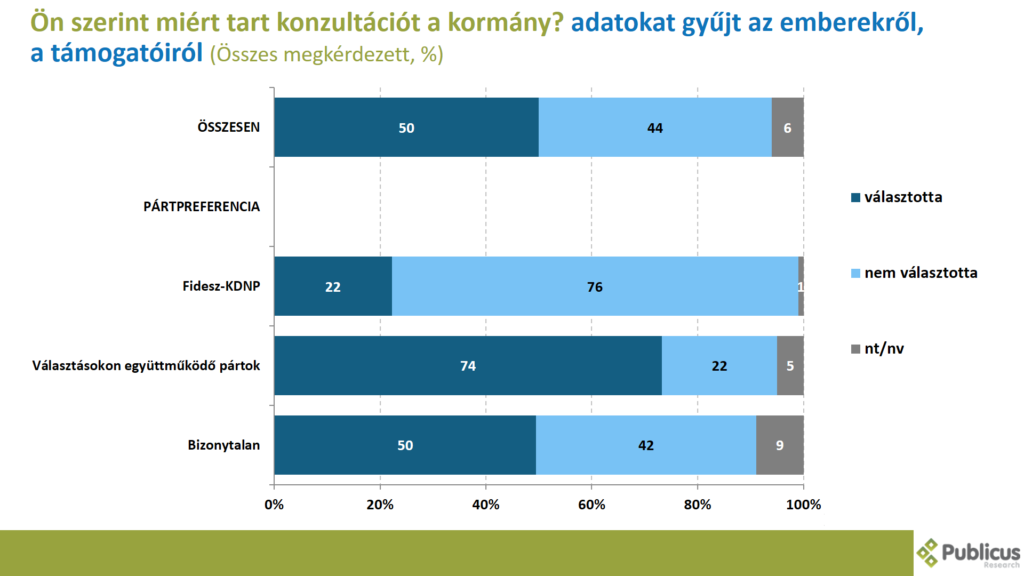 A választásokon együttműködő ellenzéki pártok szavazóinak a háromnegyede (74 százalék), a bizonytalan szavazók fele (50 százalék), illetve a Fidesz szavazók közel negyede (22 százalék) szerint azért tart konzultációt a kormány, hogy adatokat gyűjtsön az emberekről, a támogatóiról.