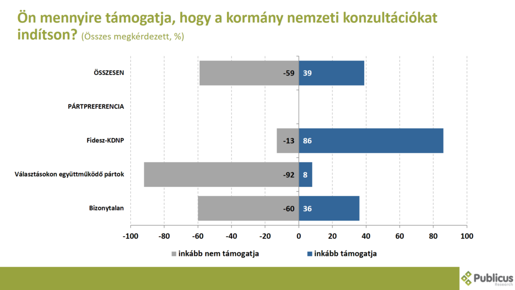 Tízből hat (59 százalék) válaszadó inkább nem támogatja, hogy a kormány nemzeti konzultációt indítson. Így nyilatkozott a választásokon együttműködő ellenzéki pártok szavazói közül tízből kilenc (92 százalék), tízből hat (60 százalék) bizonytalan szavazó, illetve a Fidesz szavazóinak a 13 százaléka.