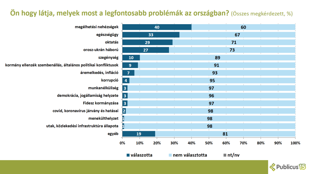 Tízből négy megkérdezett szerint a megélhetési nehézségek tartoznak ma a legfontosabb problémák közé Magyarországon. A válaszadók harmada az egészségügyet emelte ki, tízből három megkérdezett pedig az oktatásügyet. Szintén tízből három válaszadó az orosz-ukrán háborút nevezte meg, mint a legfontosabb problémák egyikét.