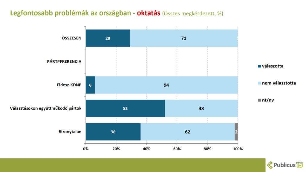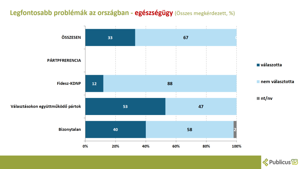 A választásokon együttműködő ellenzéki pártok szavazóinak enyhe többsége (52 százalék), tízből közel négy (36 százalék) bizonytalan szavazó, illetve a Fidesz szavazók 6 százaléka mondta, hogy az egészségügy a legfontosabb problémák egyike az országban.
