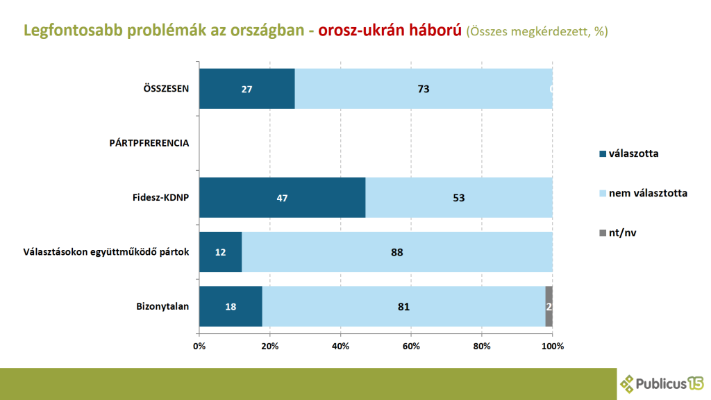 Közel minden második (47 százalék) Fidesz szavazó, minden ötödik (18 százalék) bizonytalan szavazó, továbbá választásokon együttműködő ellenzéki pártok szavazóinak a tizede (12 százalék) szerint az orosz-ukrán háború tartozik most a legfontosabb problémák közé.
