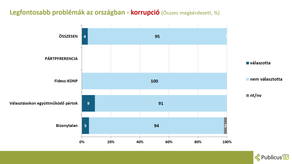 A választásokon együttműködő ellenzéki pártok szavazóinak a tizede (9 százalék), a bizonytalan szavazóknak pedig az öt százaléka mondta azt, hogy a korrupció tartozik most a legfontosabb problémák közé.