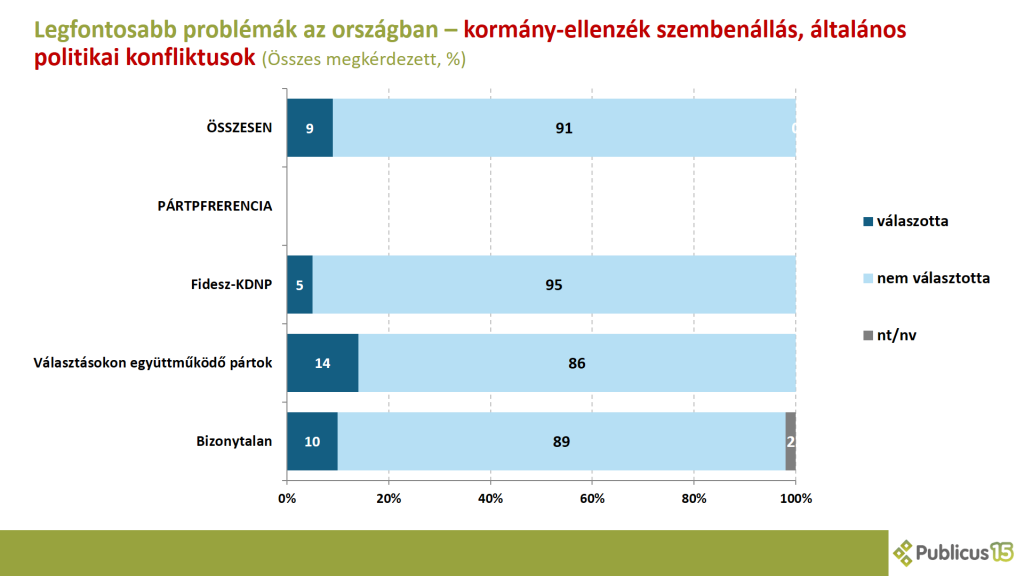 A választásokon együttműködő ellenzéki pártok szavazóinak a 14 százaléka, minden tizedik (10 százalék) bizonytalan szavazó, illetve a Fidesz szavazók 5 százaléka mondta, hogy a kormány-ellenzék szembenállás, az általános politikai konfliktusok tartoznak most a legfontosabb problémák közé.