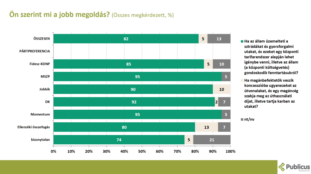 Tízből nyolc (82 százalék) válaszadó szerint az a jobb megoldás, ha az állam üzemelteti a sztrádákat és gyorsforgalmi utakat, és ezeket egy központi tarifarendszer alapján lehet igénybe venni, illetve az állam (a központi költségvetés) gondoskodik fenntartásukról.