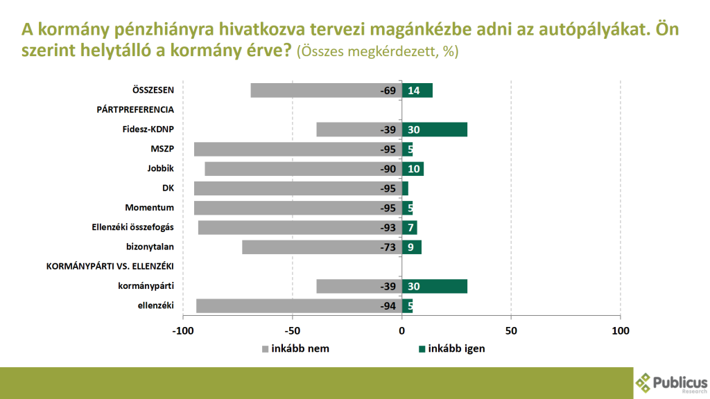 Tízből hét (69 százalék) megkérdezett szerint inkább nem helytálló a kormány érve, hogy pénzhiányra hivatkozva tervezi magánkézbe adni az autópályákat. Így látja szinte az összes ellenzéki szavazó (94 százalék), a bizonytalan szavazók háromnegyede (73 százalék), illetve még tízből négy (39 százalék) Fidesz szavazó is.