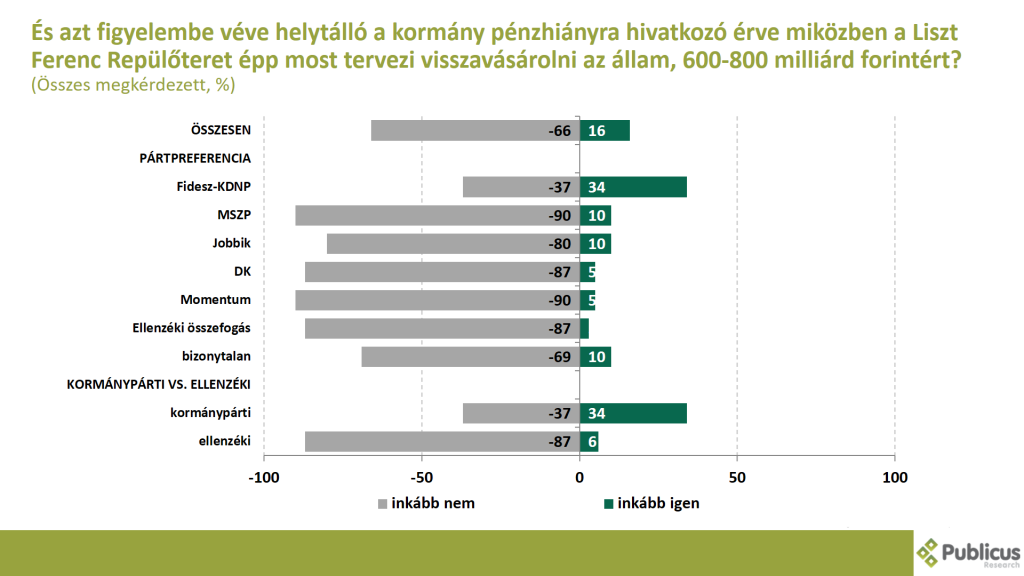 A megkérdezettek kétharmada (66 százalék) szerint figyelembe véve azt, hogy a Liszt Ferenc Repülőteret éppen most tervezi visszavásárolni az állam, 600-800 milliárd forintért, inkább nem helytálló a kormány pénzhiányra hivatkozó érve. Így gondolja tízből kilenc (87 százalék) ellenzéki szavazó, tízből hét (69 százalék) bizonytalan szavazó, illetve tízből négy (37 százalék) kormánypárti szavazó is.