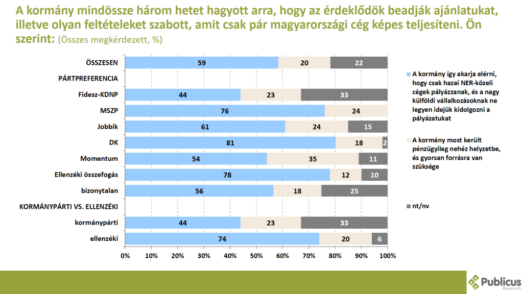 Tízből hat (59 százalék) megkérdezett szerint azáltal, hogy a kormány mindössze három hetet hagyott arra, hogy az érdeklődők beadják ajánlatukat, illetve olyan feltételeket szabott, amit csak pár magyarországi cég képes teljesíteni, a Fidesz így akarja elérni, hogy csak hazai NER-közeli cégek pályázzanak, és a nagy külföldi vállalkozásoknak ne legyen idejük kidolgozni a pályázatukat. Így látja az ellenzéki szavazók kétharmada (74 százalék), tízből hat (56 százalék) bizonytalan szavazó, illetve a kormánypárti szavazók kicsit kevesebb mint fele is (44 százalék).