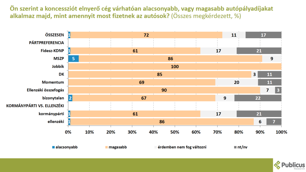 Tízből hét válaszadó szerint a koncessziót elnyerő cég várhatóan magasabb autópályadíjakat alkalmaz majd, mint amennyit most fizetnek az autósok. Így gondolja tízből kilenc ellenzéki szavazó, tízből hét (67 százalék) bizonytalan szavazó, továbbá tízből hat (61 százalék) kormánypárti szavazó is.