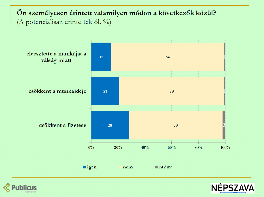 Közel minden hetedik (15 százalék) megkérdezett elvesztette a munkáját, minden ötödiknek (21 százalék) csökkent a munkaideje, továbbá tízből három (28 százalék) válaszadónak csökkent a fizetése a válság miatt.
