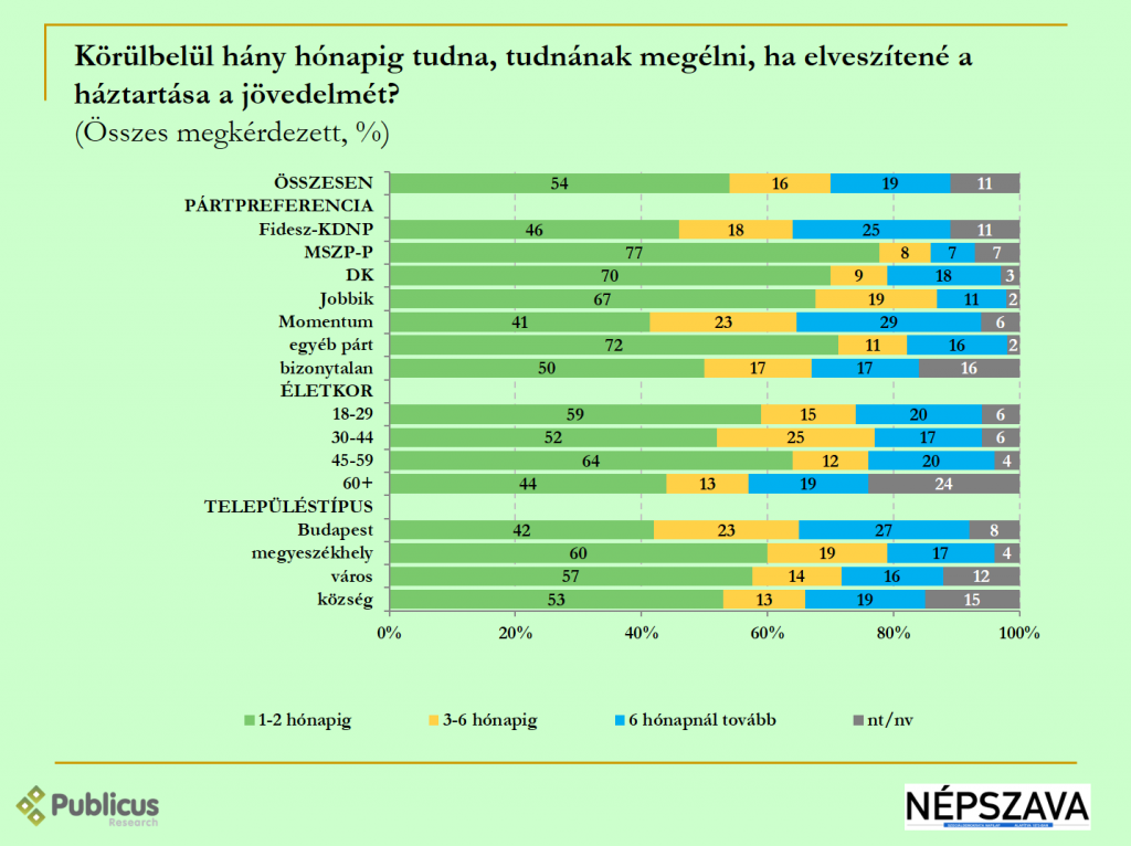 Tízből három Momentum (29 százalék) szavazó, továbbá a Fidesz szavazók negyede (25 százalék) hat hónapnál is tovább kibírná, ha elveszítené háztartása jövedelmét.