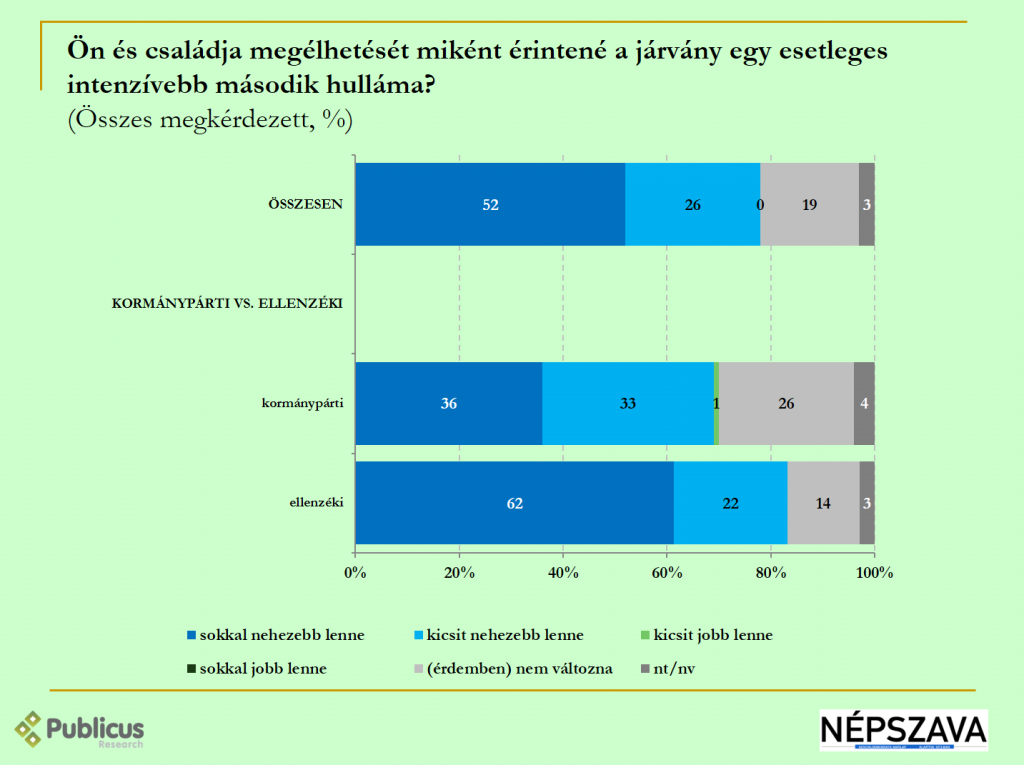 Minden második (52 százalék) megkérdezettnek és családjának a megélhetését sokkal nehezebben érintené, ha beütne a járvány esetlegesen intenzívebb második hulláma. A válaszadók negyedének (26 százalék) kicsit lenne nehezebb, ötödének pedig (19 százalék) érdemben nem változna a helyzete, ha jönne egy erősebb második hullám.