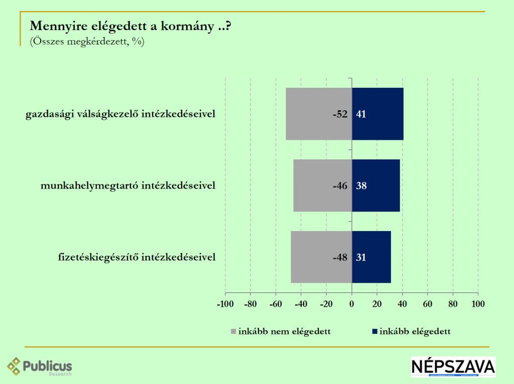 A válaszadók több mint fele (52 százalék) inkább nem elégedett a kormány válságkezelő intézkedéseivel, a közel fele pedig szintén inkább elégedetlen a kormány fizetéskiegészítő lépéseivel, illetve a munkahelymegtartó döntéseivel. (48-46 százalék)