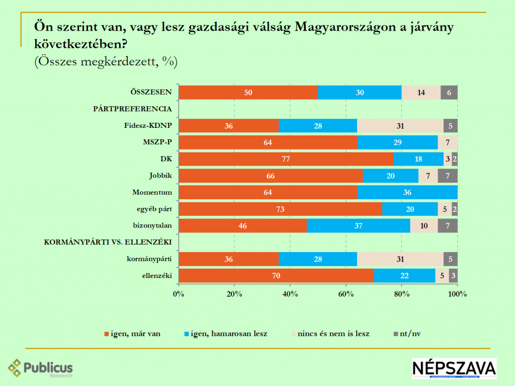 Tízből öt (50 százalék) megkérdezett szerint a járvány következtében már van, tízből három (30 százalék) szerint pedig hamarosan lesz gazdasági válság Magyarországon. Csak közel minden hetedik (14 százalék) válaszadó mondta azt, hogy nincs és nem is lesz gazdasági visszaesés hazánkban.