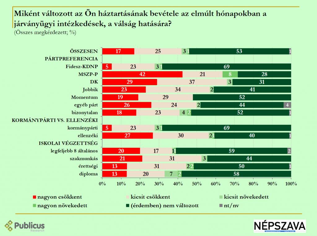 Publicus Intézet a Népszava megbízásából augusztus  27 – 31. között 1009 fő megkérdezésével készített országos reprezentatív közvéleménykutatásban vizsgálta, hogy a lakosságot hogyan érintette a koronavírus okozta gazdasági válság.