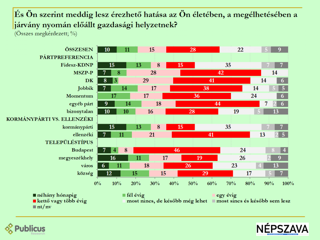 Tízből három (28 százalék) megkérdezett szerint kettő vagy több évig is érezhető hatása lesz az életében, a megélhetésében a járvány nyomán előállt gazdasági helyzet. A válaszadók negyedének (26 százalék) az életében vagy egy évig (15 százalék) vagy pedig fél évig (11 százalék) érezhető hatása lesz a válságnak. A megkérdezettek tizedének (10 százalék) néhány hónapig, az ötödének (22 százalék) pedig most nem, de később még lehet érezhető hatása a járvány nyomán előállt gazdasági helyzetnek.