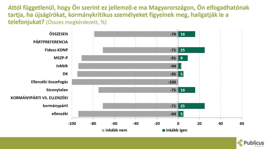 Attól függetlenül, hogy jellemző ez-e Magyarországon, tízből nyolc (79 százalék) megkérdezett inkább nem tartja elfogadhatónak azt, ha újságírókat, kormánykritikus személyeket figyelnek meg, és hallgatják le a telefonjukat.