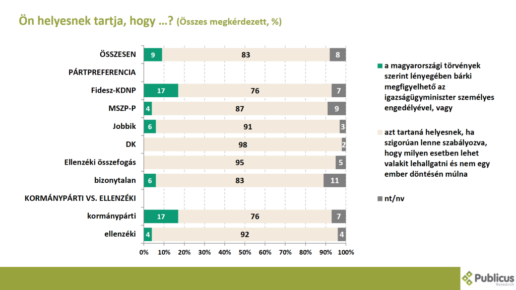 Tízből egy (9 százalék) válaszadó helyesnek tartja, hogy a magyarországi törvények szerint lényegében bárki megfigyelhető az igazságügyminiszter személyes engedélyével. Tízből nyolc (83 százalék) megkérdezett viszont azt tartaná helyesnek, ha szigorúan lenne szabályozva, hogy milyen esetben lehet valakit lehallgatni és nem egy ember döntésén múlna.
