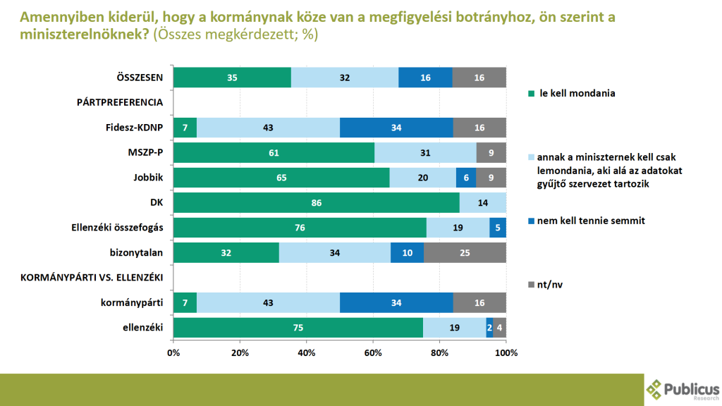 Az ellenzéki szavazók háromnegyede (75 százalék) szerint amennyiben kiderül, hogy a kormánynak köze van a megfigyelési botrányhoz, Orbán Viktor le kellene mondania. Így látja a bizonytalan szavazók harmada (34 százalék) illetve a Fidesz szavazók 7 százaléka is.