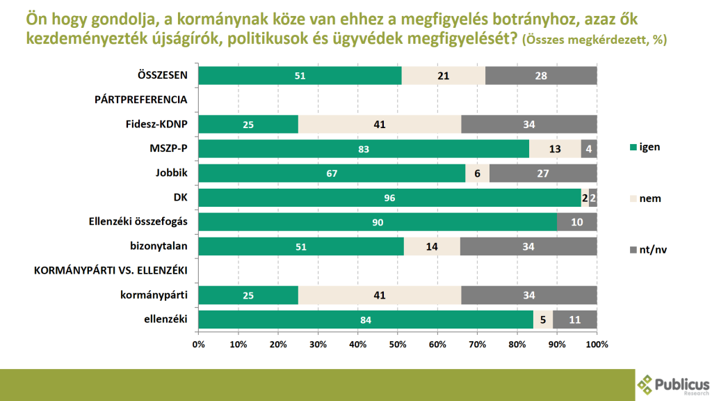 Minden második (51 százalék) megkérdezett szerint a kormánynak köze van ehhez a megfigyelés botrányhoz, azaz ők kezdeményezték újságírók, politikusok és ügyvédek megfigyelését. Így látja az ellenzéki szavazók döntő többsége (84 százalék), továbbá még minden második (51 százalék) bizonytalan szavazó, és minden negyedik (25 százalék) kormánypárti szavazó.
