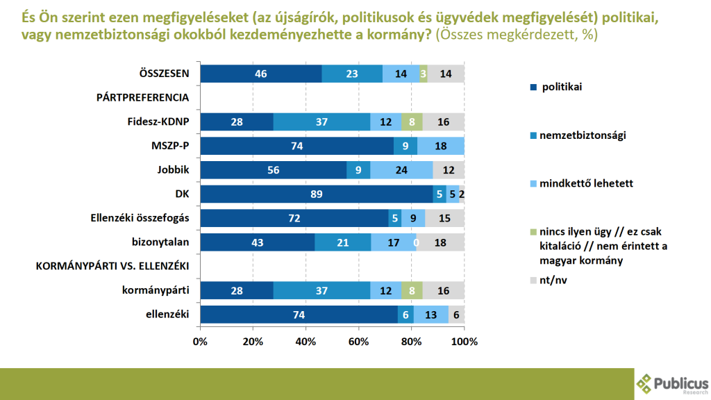 A válaszadók közel fele (46 százalék) szerint ezen megfigyeléseket (az újságírók, politikusok és ügyvédek megfigyelését) politikai okokból kezdeményezhette a kormány.