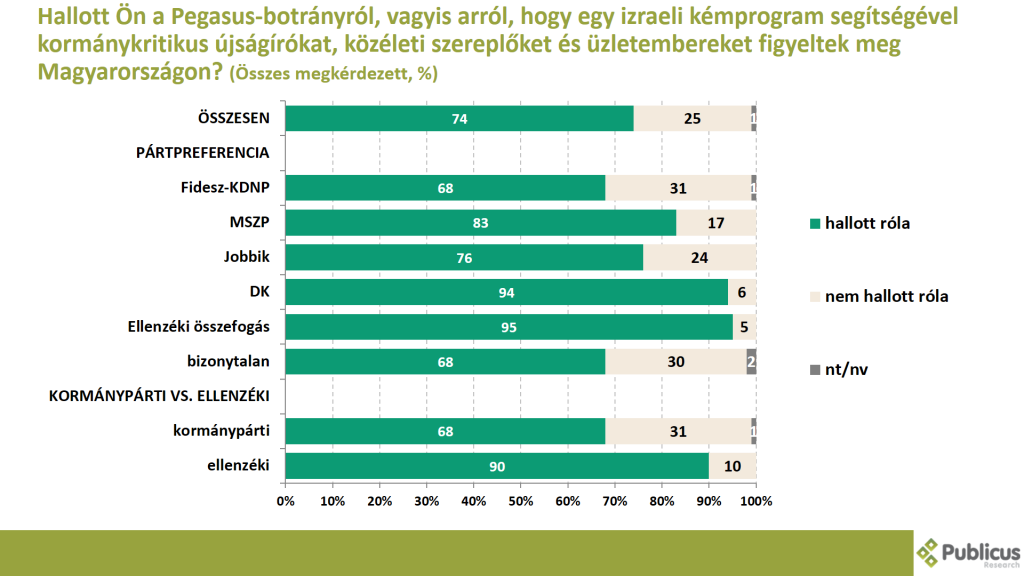 A megkérdezettek háromnegyede (74 százalék) hallott a Pegasus-botrányról, vagyis arról, hogy egy izraeli kémprogram segítségével kormánykritikus újságírókat, közéleti szereplőket és üzletembereket figyeltek meg Magyarországon.