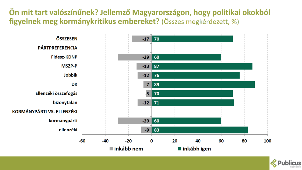 Tízből hét (70 százalék) válaszadó inkább valószínűnek tartja, hogy jellemző az Magyarországon, hogy politikai okokból figyelnek meg kormánykritikus embereket.
