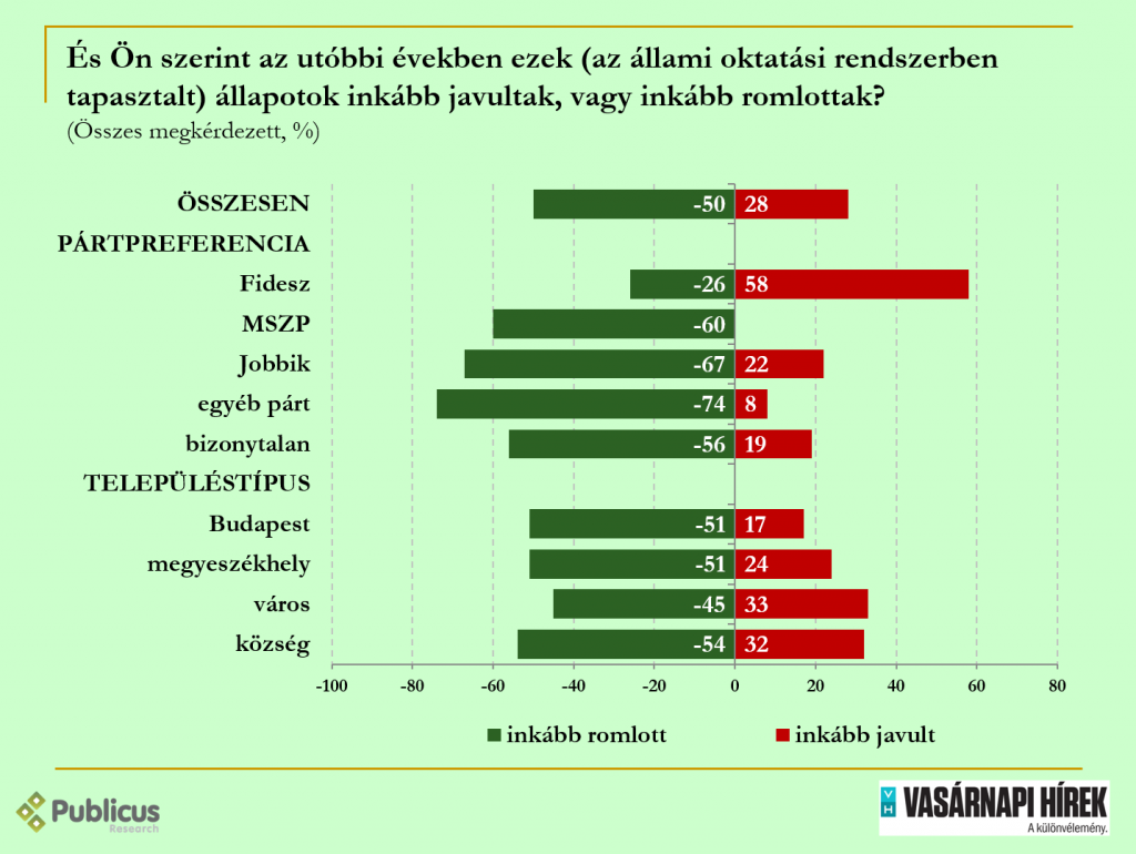 A válaszadók fele (50 százalék) szerint az elmúlt években inkább romlott az állami oktatás állapota, míg mindössze negyedük (28 százalék) szerint inkább javult. Itt is a Fidesz szavazók azok, akik másként gondolkodnak, körükben többségben vannak (58 százalék) azok, akik szerint javultak az állapotok az állami oktatásban, míg a többi párt szavazói és a bizonytalanok szerint inkább romlottak (MSZP 60, Jobbik 67, egyéb párt: 74, bizonytalan 56 százalék). Továbbá, minél nagyobb településen lakik valaki, annál kevésbé gondolja úgy, hogy javult az állami oktatás állapota.