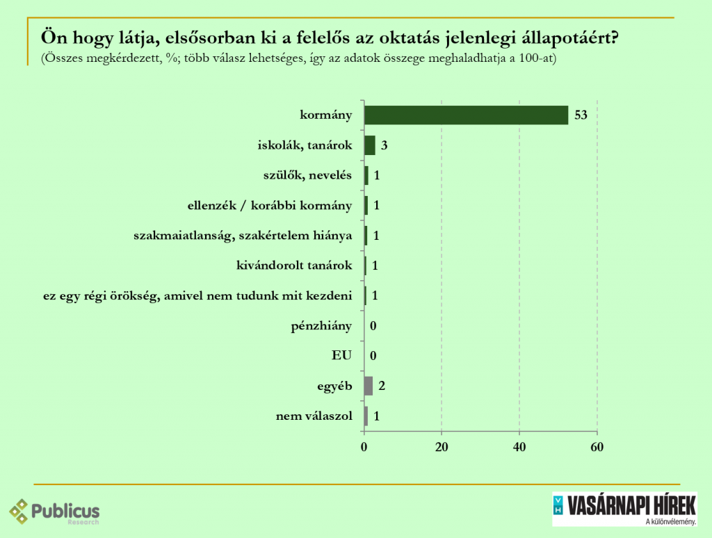 A megkérdezettek túlnyomó többsége (53 százalék) szerint az állami oktatás jelenlegi állapotáért a kormány a felelős, míg mindössze 3 százalék tartja felelősnek az iskolákat, tanárokat. Ebben minden vizsgált társadalmi csoport, így a Fidesz szavazók is eképpen gondolkodnak.