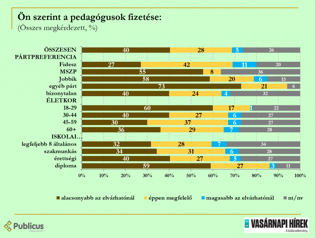 Leginkább az egyéb pártok szavazói, a 30 évnél fiatalabbak, valamint a diplomások (73, 60, 59 százalék) gondolkodnak így. Mindössze két társadalmi csoportban vannak többségben, ahol nincs többsége annak a véleménynek, hogy a pedagógusok fizetése alacsonyabb az elvárhatónál: a Fidesz szavazók és a 45-59 évesek körében (27 és 32 százalék). Ezekben a csoportokban úgy gondolják, hogy a pedagógusok fizetése megfelelő. Minden tíz Fidesz szavazóból egy (11 százalék) úgy gondolja, hogy túl magas a pedagógusok fizetése.