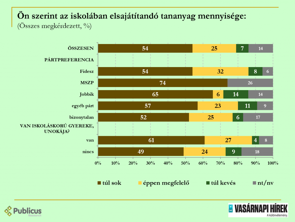 A megkérdezettek több mint fele (54 százalék) szerint túl sok az iskolában elsajátítandó tananyag mennyisége, negyede (25 százalék) szerint épp megfelelő, míg mindössze 7 százalék említi azt, hogy túl kevés. Ebben a kérdésben minden vizsgált társadalmi csoport hasonlóan gondolkodik, de azok között, akiknek van iskoláskorú gyermeke vagy unokája, többen vannak, akik úgy látják, hogy túl sok a tananyag (61 százalék), mint akinek nincs (49 százalék).
