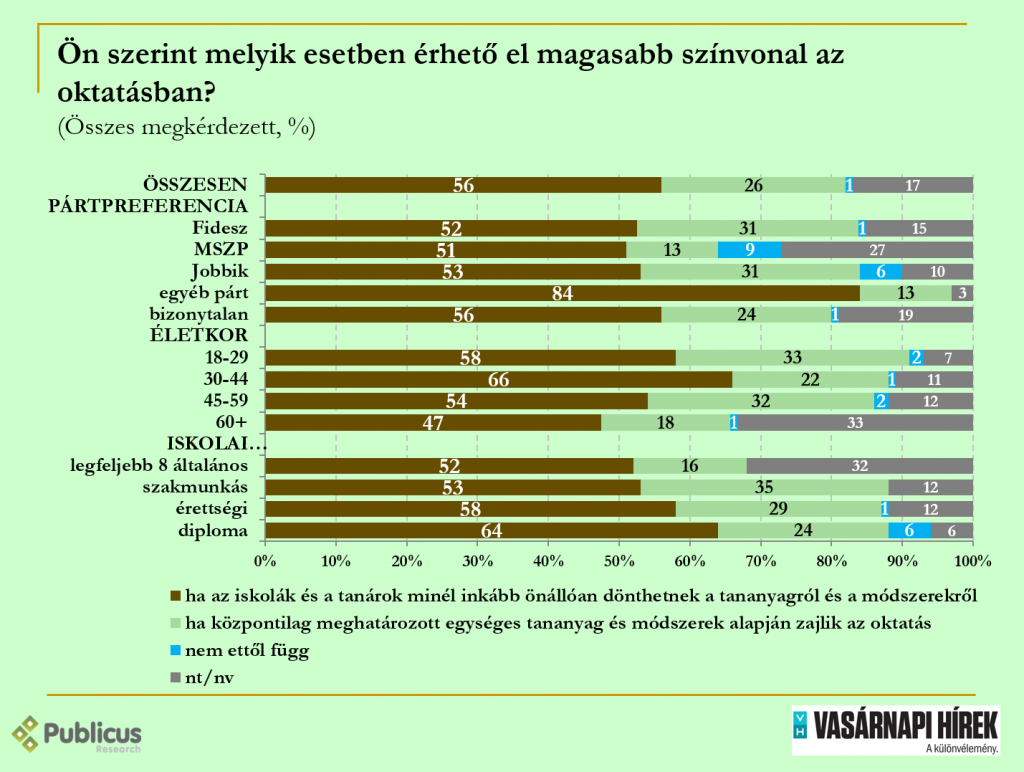 A válaszadók több mint fele (56 százalék) úgy látja, hogy úgy érhető el magasabb színvonal az oktatásban, hogy az iskolás és a tanárok minél inkább önállóan dönthetnek a tananyagról és az oktatási módszerekről. Ezzel szemben a megkérdezettek negyede (26 százalék) szerint akkor magasabb az oktatás színvonala, hogy központilag meghatározott egységes tananyag és módszerek alapján zajlik az oktatás.