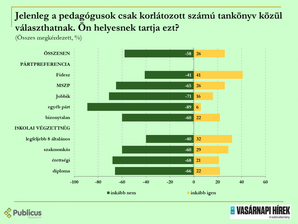 A Fidesz szavazók megosztottak a kérdésben (41-41 százalék), de az összes többi vizsgált társadalmi csoport, leginkább az egyéb pártok szavazói, az érettségivel és diplomával rendelkezők (89, 68, 66 százalék) helytelenítik a tankönyvválasztás korlátozását.