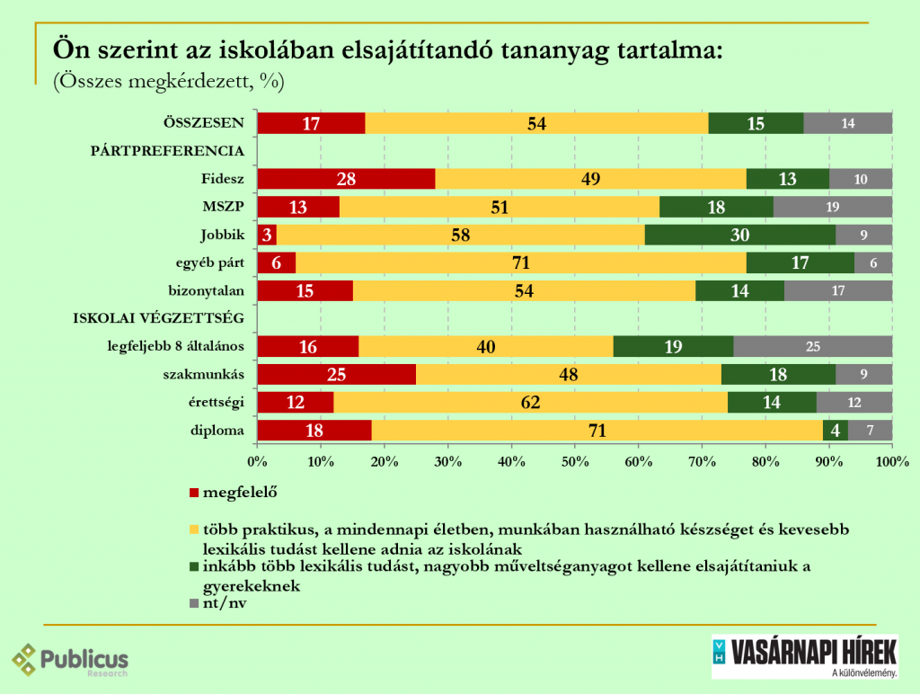 A válaszadók többsége (54 százalék) szerint több praktikus, a mindennapi életben, munkában használható készséget és kevesebb lexikális tudást kellene adnia az iskoláknak, míg csupán a megkérdezettek 15 százaléka gondolja ezt fordítva, azaz, hogy több lexikális tudást, nagyobb műveltséganyagot kellene elsajátítani a gyermekeknek.