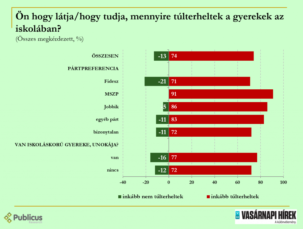 Mindkét kérdésben hasonlóan gondolkodik minden vizsgált társadalmi csoport. A diákok leginkább az MSZP és a Jobbik szavazók, valamint az iskoláskorú gyerekeket nevelők szerint túlterheltek (91, 86 és 77 százalék), de még a Fidesz szavazók és a bizonytalanok körében is 71 és 72 százalék így gondolkodik.